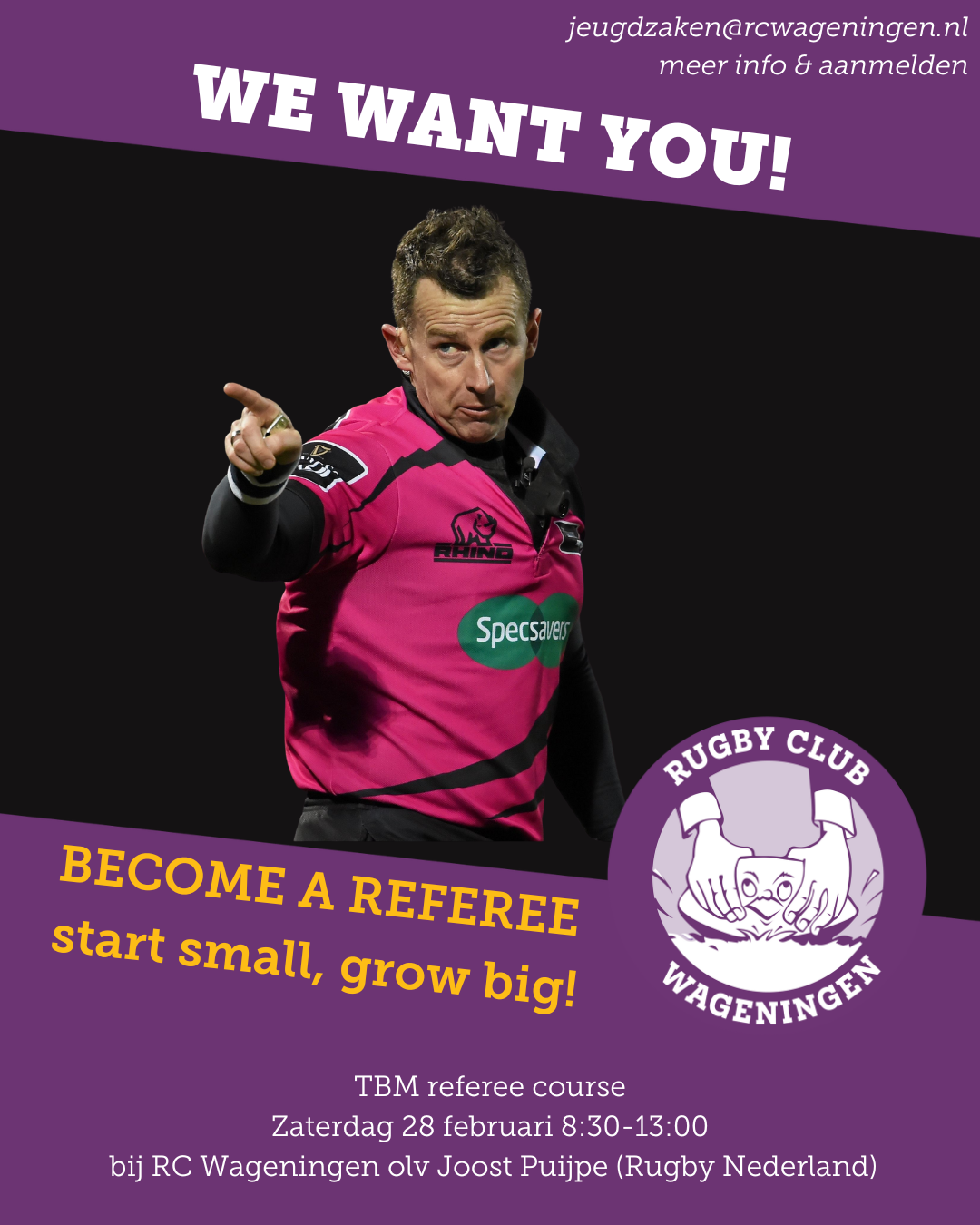 Doe mee aan de TBM scheidsrechter cursus op zaterdag 28 februari! Neem contact op met jeugdzaken@rcwageningen.nl voor meer info & aanmelden.