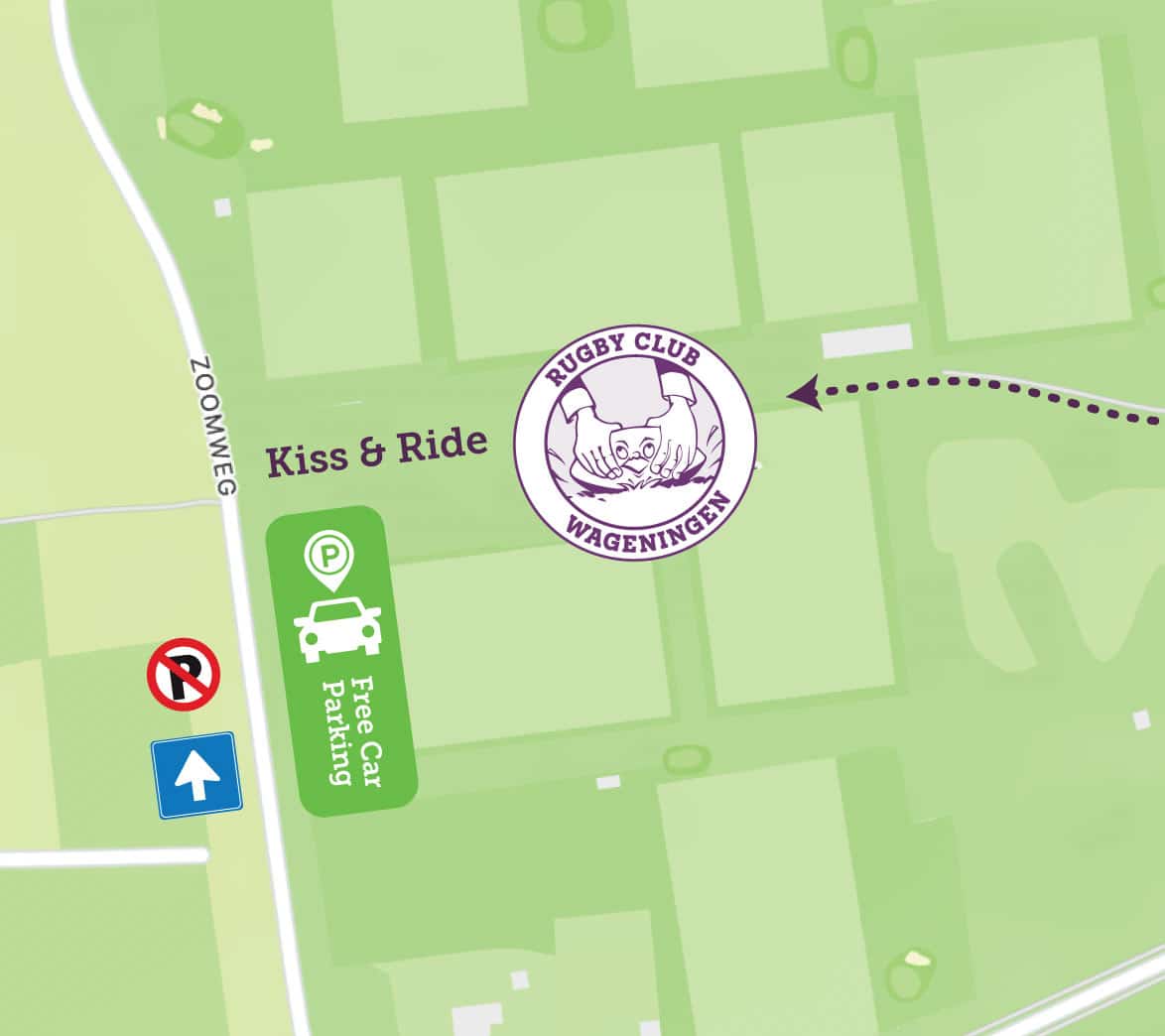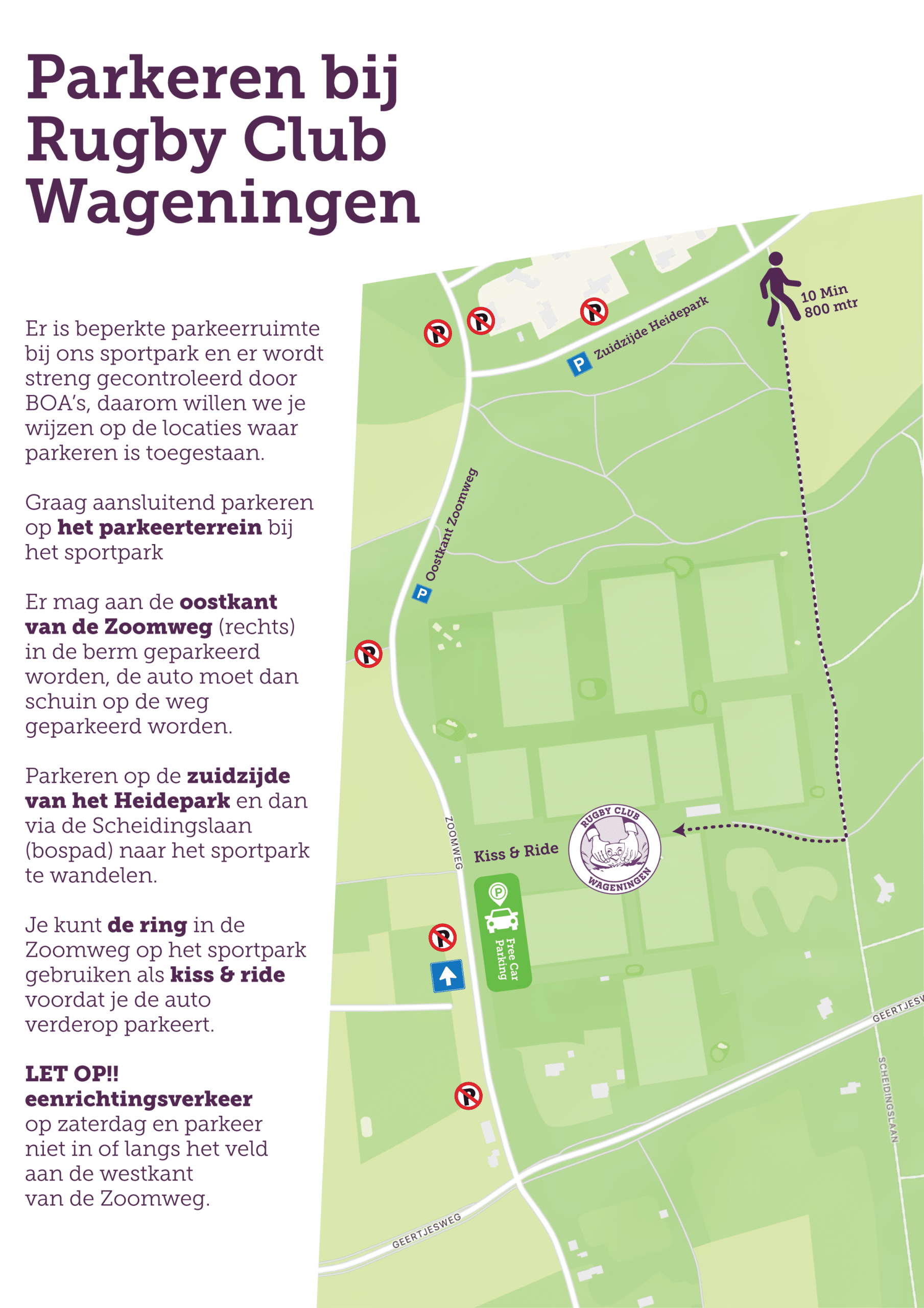 Op het sportpark mag alleen in vakken geparkeerd worden, of bij drukte schuin in de berm aan de westzijde van de Zoomweg. Op zaterdagen geldt op de Zoomweg eenrichtingsverkeer vanuit het zuiden (toegang alleen vanaf de Geertjesweg / Dorskampweg). Er wordt regelmatig gecontroleerd.