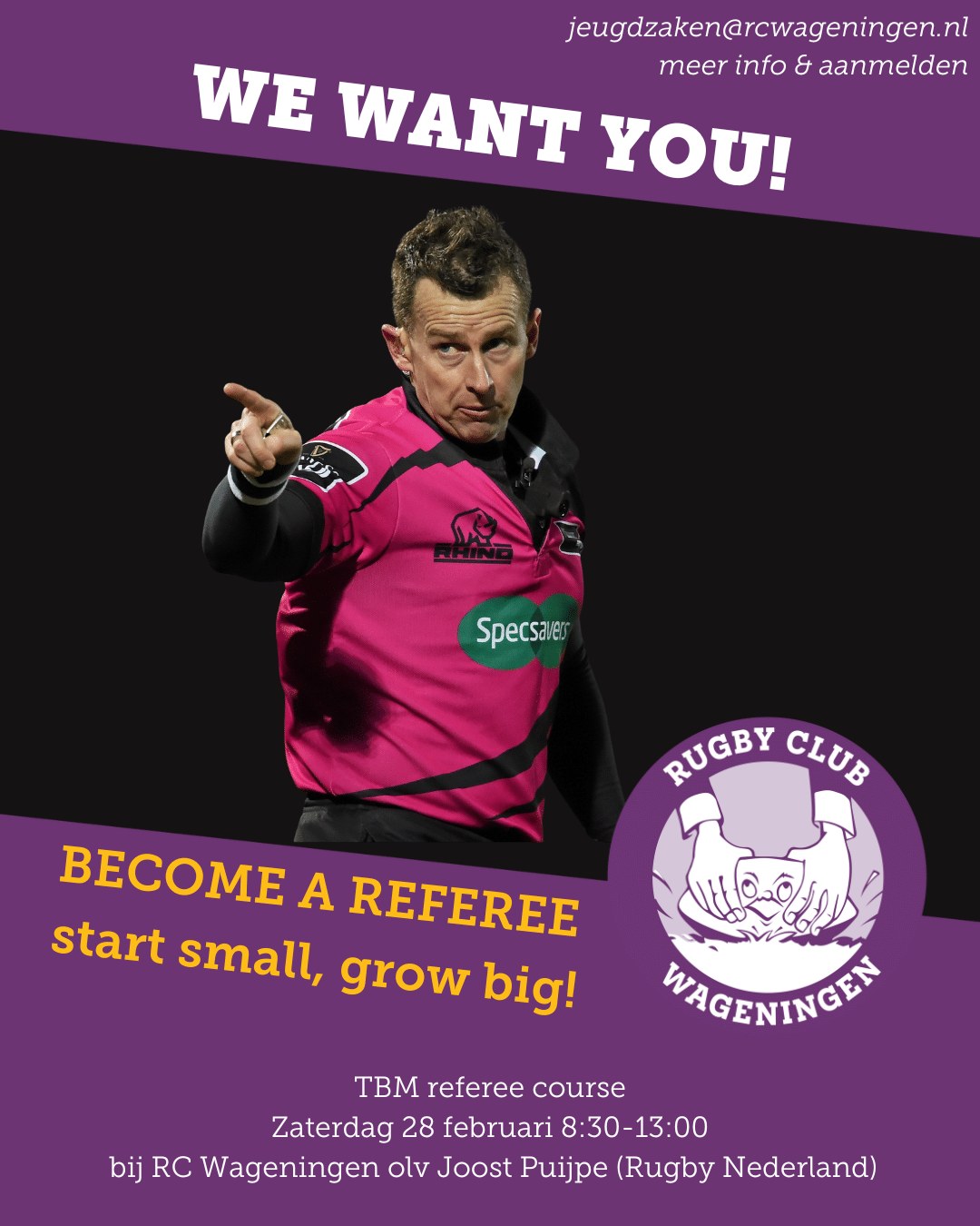 Doe mee aan de TBM scheidsrechter cursus op zaterdag 28 februari! Neem contact op met jeugdzaken@rcwageningen.nl voor meer info & aanmelden.
